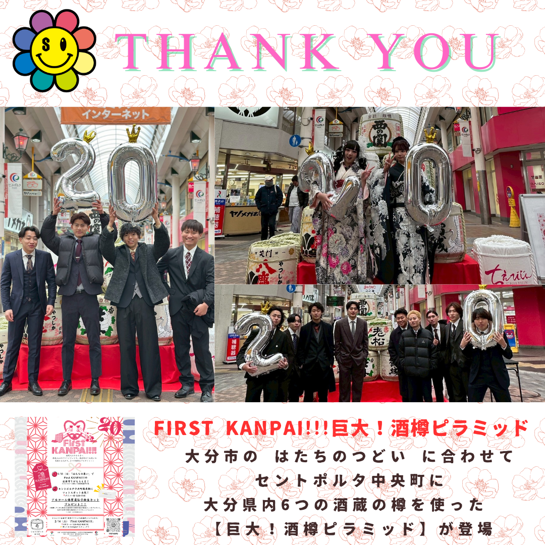 【開催終了】First KANPAI!!! 巨大!酒樽ピラミッド 2025年度 First KANPAI!!! 巨大!酒樽ピラミッドフォトスポット事業 ご参加いただき、ありがとうございました。 内容①お酒守りプレゼント②酒樽フォトスポット③アルコール体質 遺伝子検査キット配布 開催日:2026年1月11日(日) 主催:大分市中央町商店街振興組合、大分市竹町通商店街振興組合運営:株式会社Cherish Living