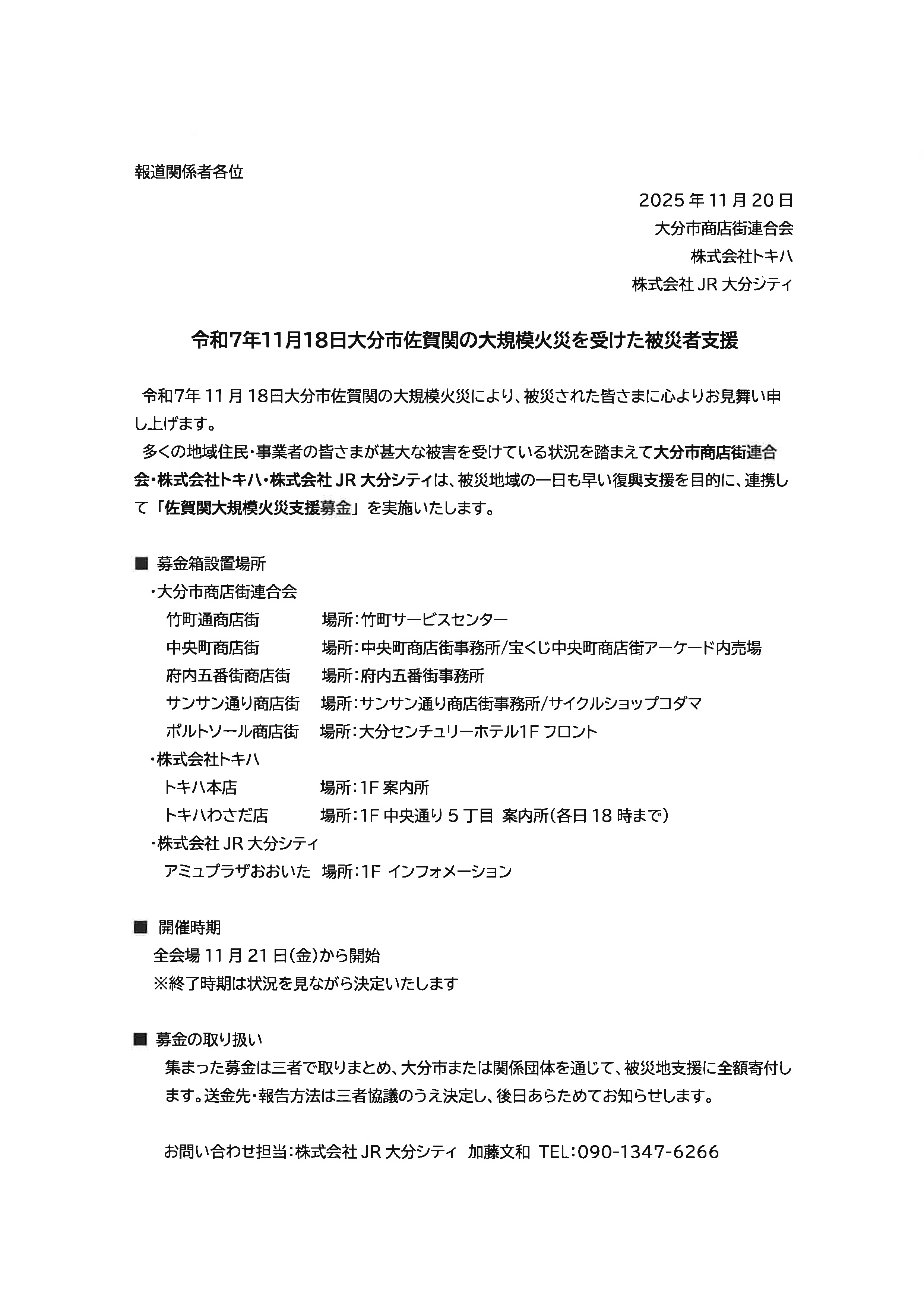 集まった募金は、大分市商店街連合会・株式会社トキハ・株式会社JR大分シティの三者で取りまとめ、大分市または関係団体を通じて、被災地支援に全額寄付されます。 送金先・報告方法は三者協議のうえ決定し、後日改めてお知らせいたします。